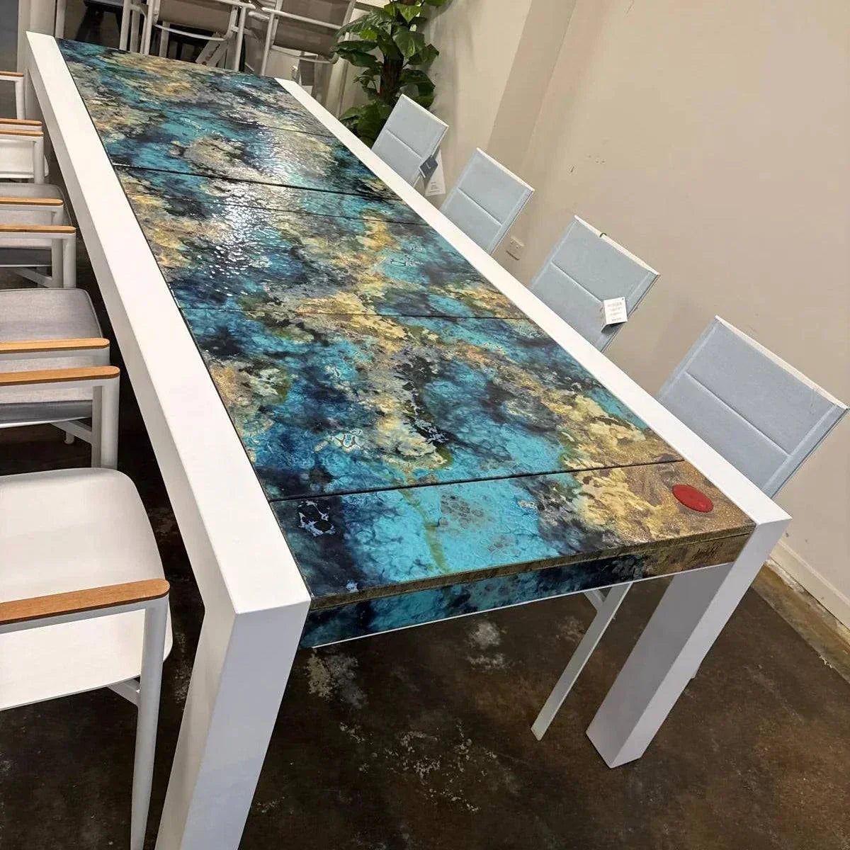 The lava stone surface of the Imperial Italian Lava Stone Dining Table is individually hand-painted and double-baked at high temperatures to permanently fuse colour and glaze with the stone. This unique process ensures a surface resistant to UV rays, stains, salt spray, and acids, while also allowing it to endure extreme temperatures ranging from -50°C to 1000°C. Supported by a strong powder-coated metal frame, the table blends timeless craftsmanship with contemporary minimalism, making it suitable for both luxurious indoor dining rooms and stylish outdoor terraces.