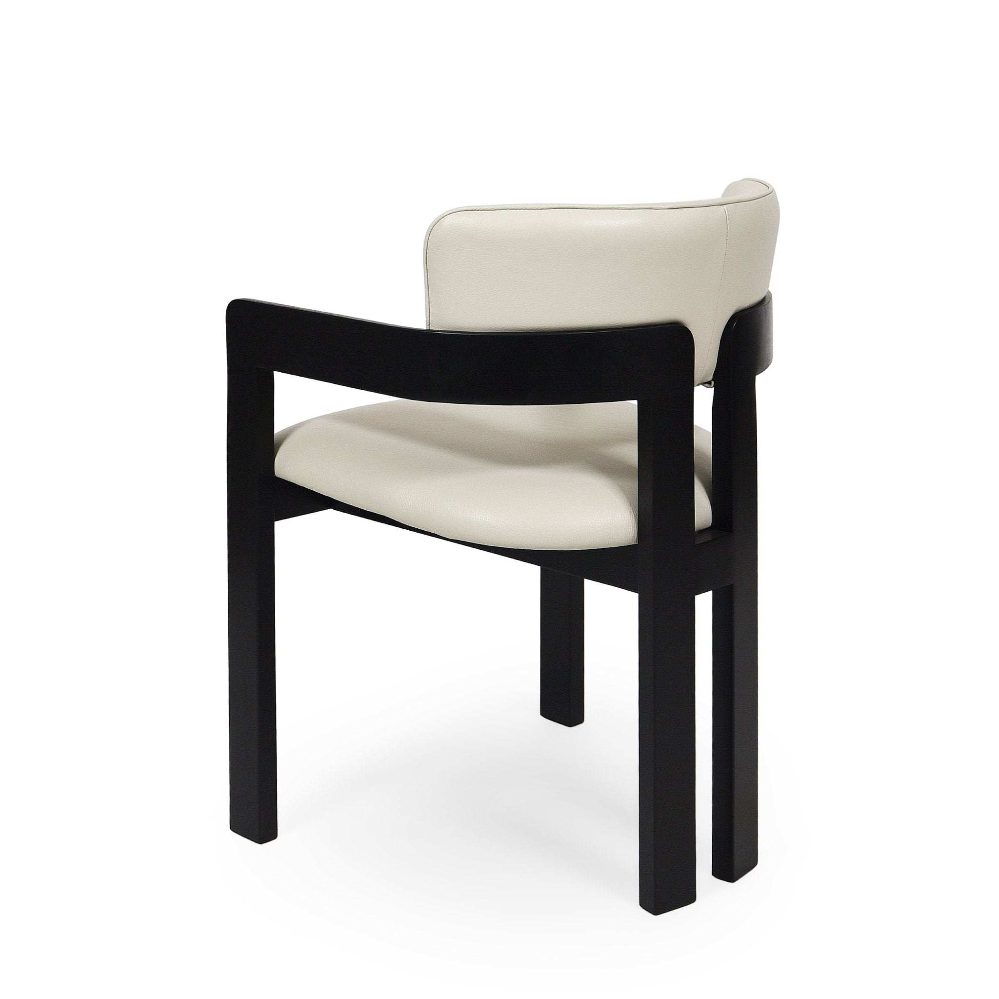 The Enzo Carver Chair enhances the classic Enzo design with the addition of integrated armrests, offering extra comfort and a more relaxed seating experience. Its strong, geometric frame—available in black-stained oak or walnut—creates a bold visual statement while maintaining a refined aesthetic.