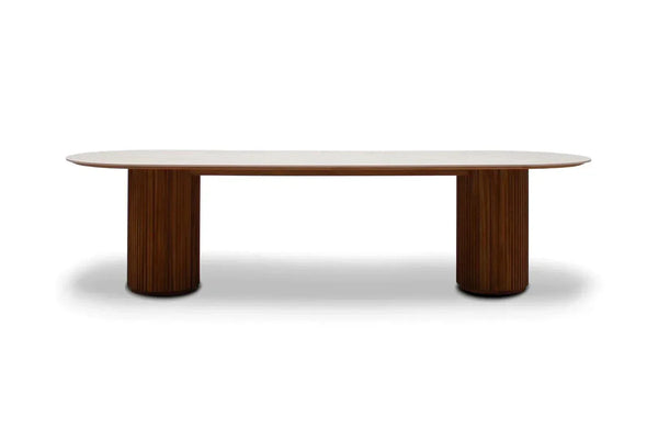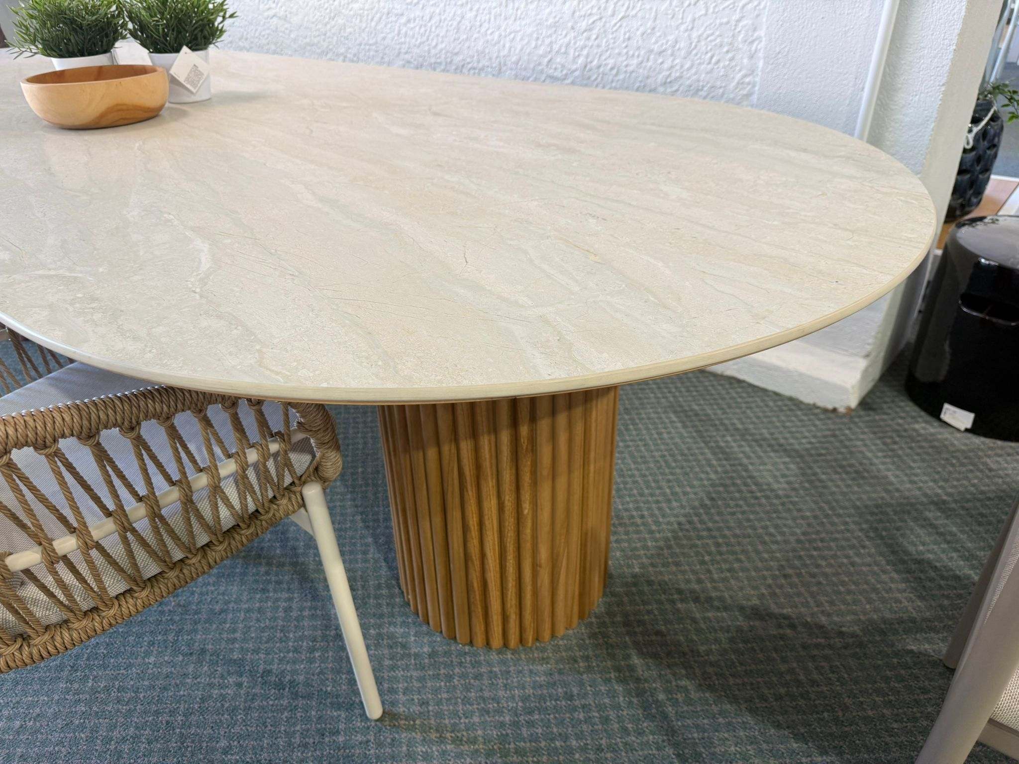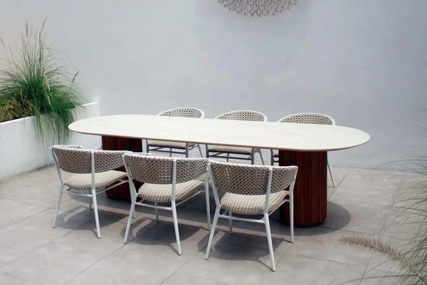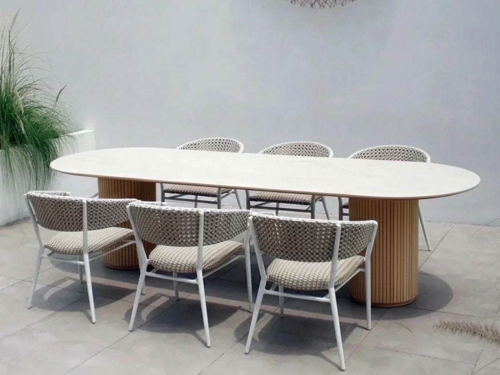 The Toledo Ceramic Outdoor Dining Table redefines sophistication for modern outdoor living. Designed to combine organic warmth with architectural balance, it features a beautifully curved oval top crafted from premium ceramic — a material chosen for its natural texture, durability, and refined aesthetic. Resting on two solid teak cylinder bases, this table blends contemporary design with timeless craftsmanship, creating an elegant focal point for any alfresco space. Its generous size comfortably accommodates large gatherings while maintaining a soft, welcoming presence.